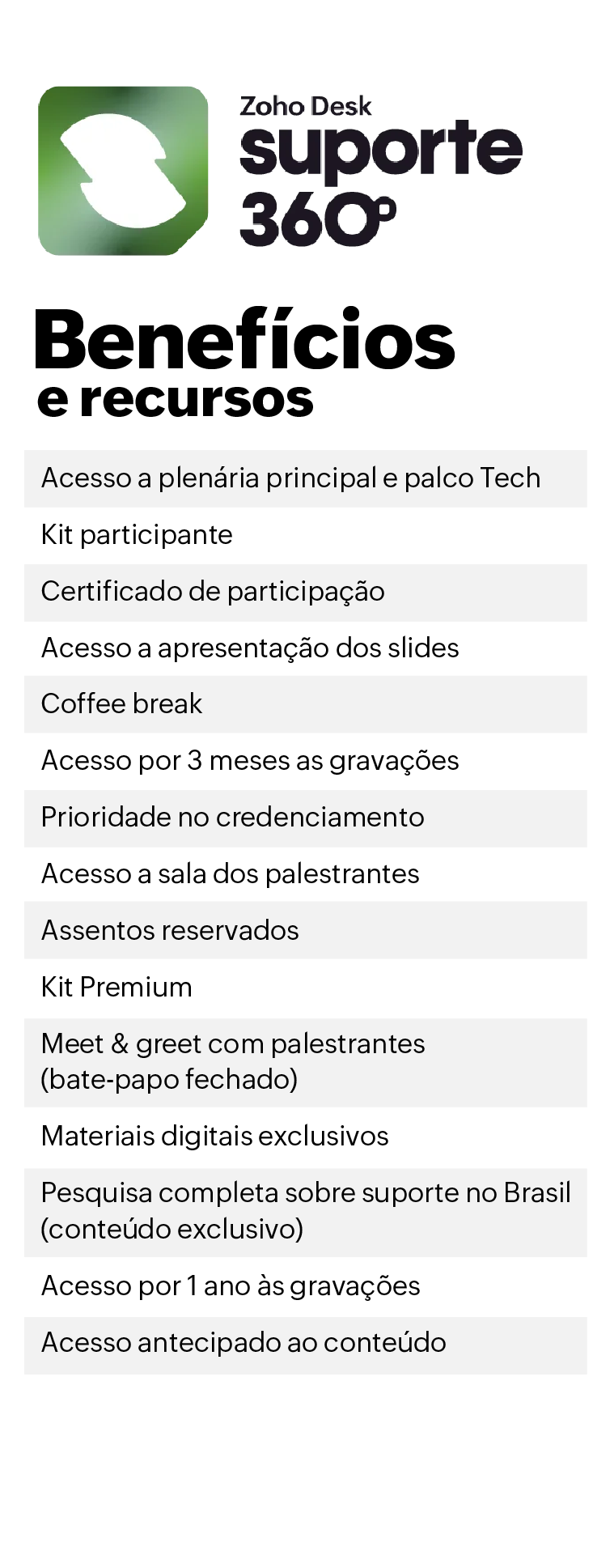 O Suporte 360 é voltado para profissionais em posições de liderança (supervisor, coordenador, diretor, head) nas áreas de suporte e atendimento ao cliente. Com uma imersão em conteúdos técnicos e estratégicos, o evento foi desenvolvido para aqueles que definem o mercado de atendimento.